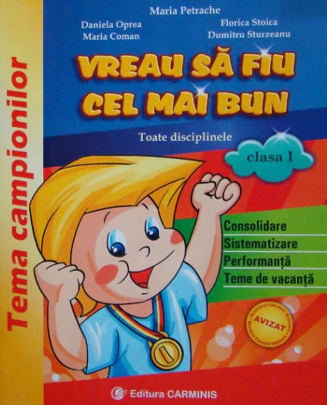 „Vreau sa fiu cel mai bun“ se adreseaza elevilor de 7 ani (clasa I), incurajandu-i sa se pregateasca pentru obtinerea performantei. Structurat in patru teme carora le corespund continuturile programei scolare, aduce informatii si solicita transferul cunostintelor dintr-un domeniu in altul. Prin formulari variate se urmareste intelegerea mesajului scris si dez-voltarea capacitatii de operare cu termeni specifici fiecarei discipline: silaba, cuvant, grup de litere, grup de sunete, enunt, text, numere pare, numere impare, suma, diferenta etc. Cerintele se adreseaza tuturor elevilor, formandu-le o imagine de sine pozitiva. Acestea pot fi rezolvate atat pe parcursul anului scolar, cat si ca tema pentru vacantele scolare.